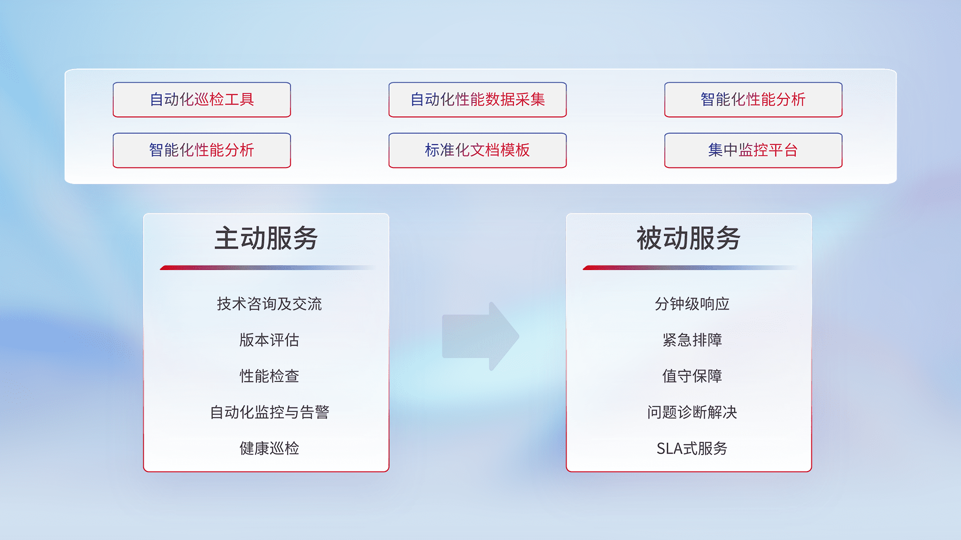 智能化工具和标准化文档,,,,保障服务质量,,,,提供主动服务(包含技术咨询、、、版本评估、、、、性能检查、、、、自动化监控与告警、、、、健康巡检)和被动服务包含(分钟级响应、、、紧急排障、、、值守保障、、、、问题诊断解决、、、SLA服务)。。