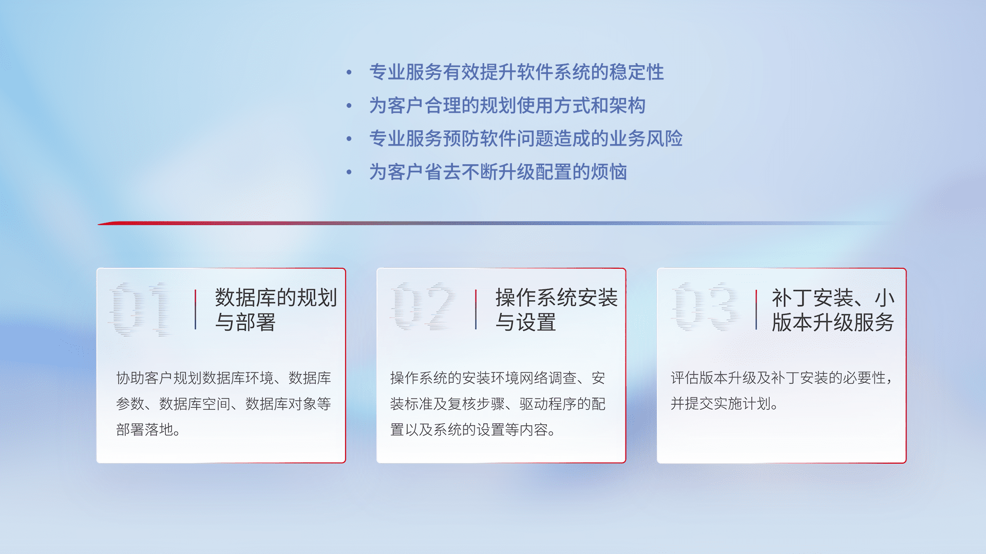 为客户提供软件规模升级、、、快速部署、、、按需配置的专业服务,,,从数据库的规划与部署到操作系统的安装与设置,,,再到补丁安装和小版本升级提供支持。。。。