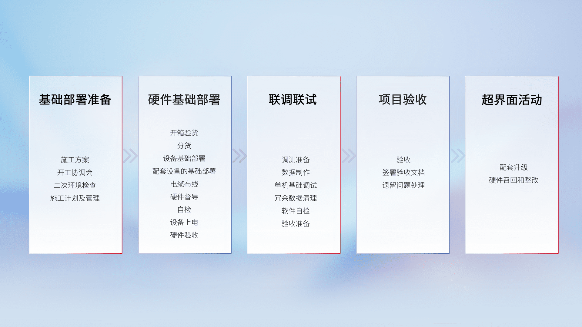 从基础部署准备、、、硬件基础部署、、、联调联试、、、、项目验收、、越界面活动的全过程可追溯,,保证施工质量和进度。。。